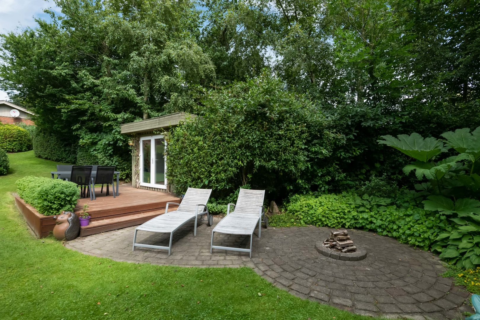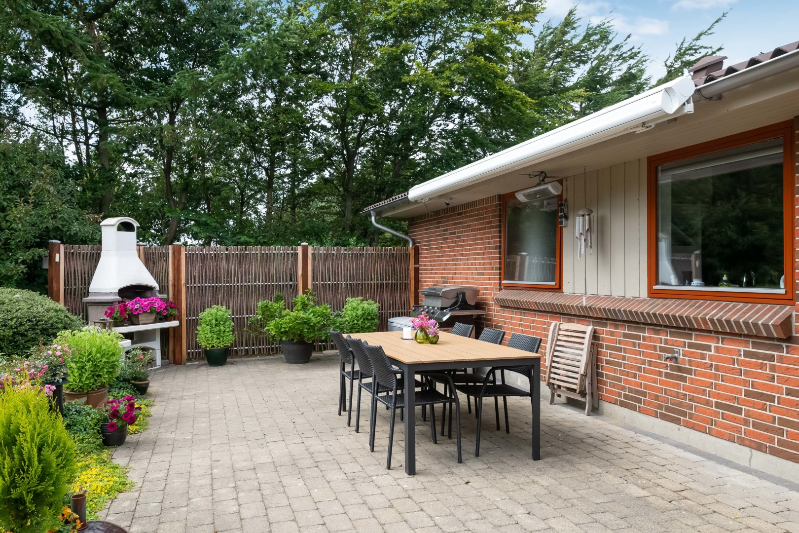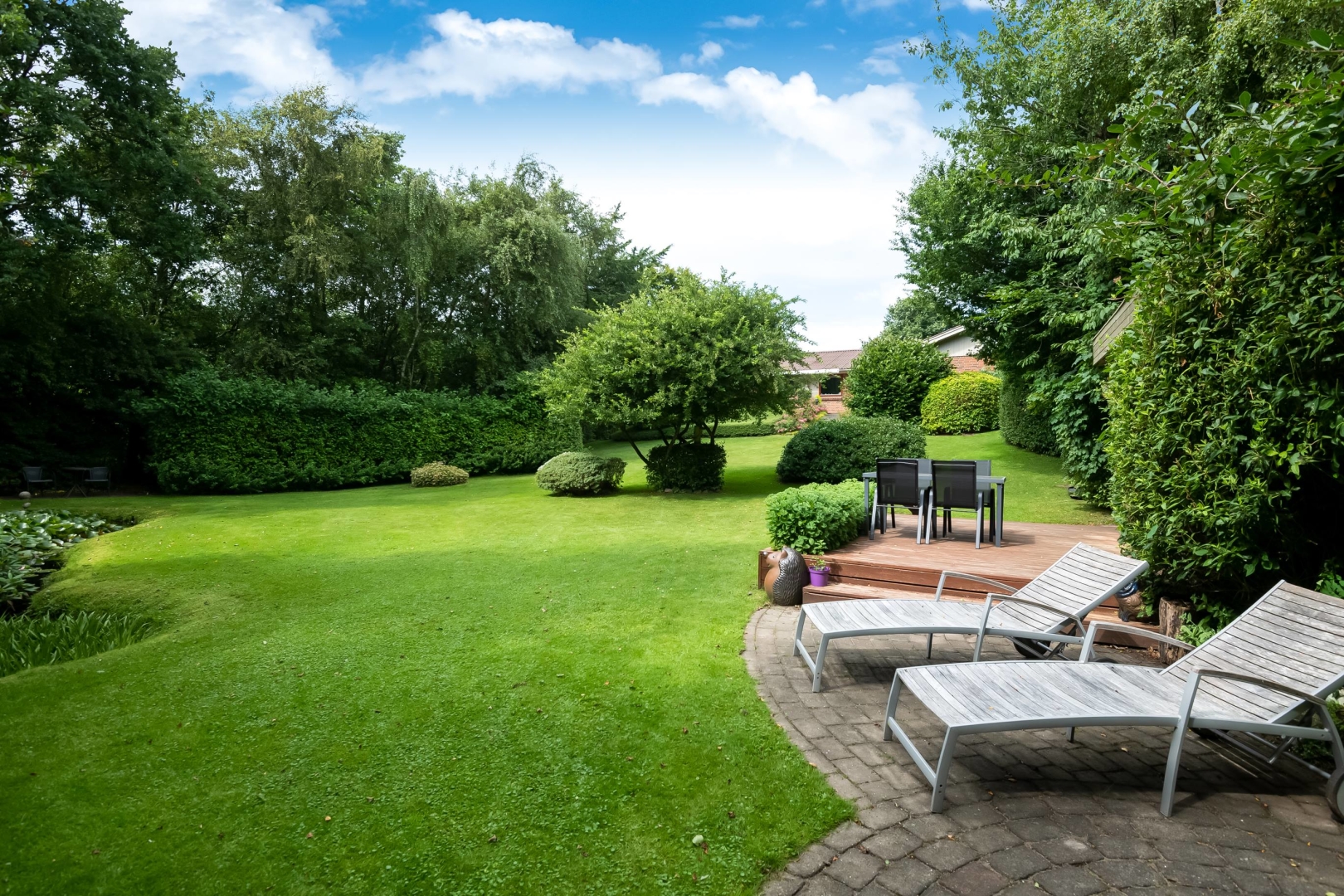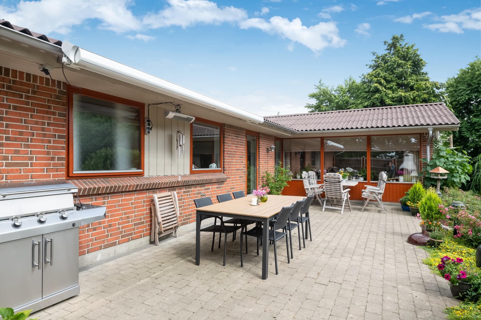 Den store have er et kapitel for sig. Stor flot sydvestvendt terrasse med trappe nedgang til fantastisk ugeneret havemiljø med mindre anneks med gode terrasser, flot mindre havesø fuld af åkander. På den sydvendte husmur er der monteret markise med automatik. Hyggelig grusbelagt indkørsel.